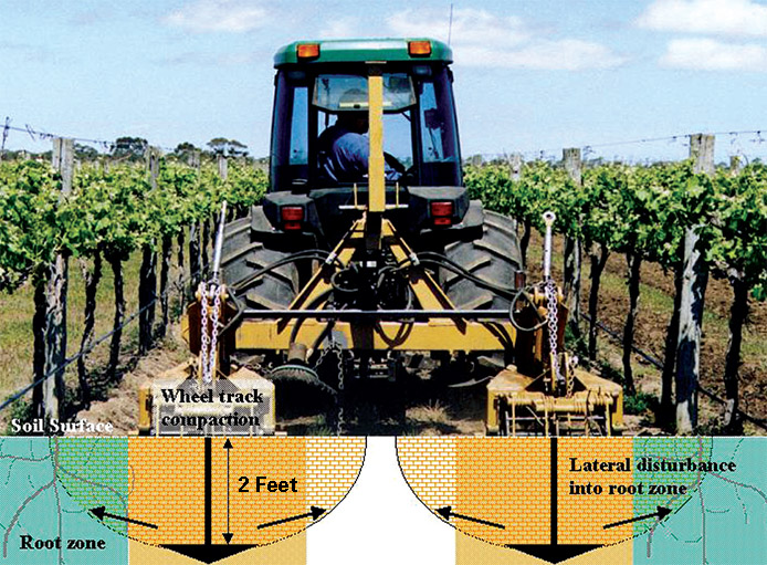 Lateral cracking into vine row within 6" of vine to remove soil compaction.